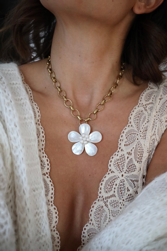 Ce joli collier est réalisé en acier inoxydable avec sa jolie fleur en nacre et il est réglable de 38 à 43cm.