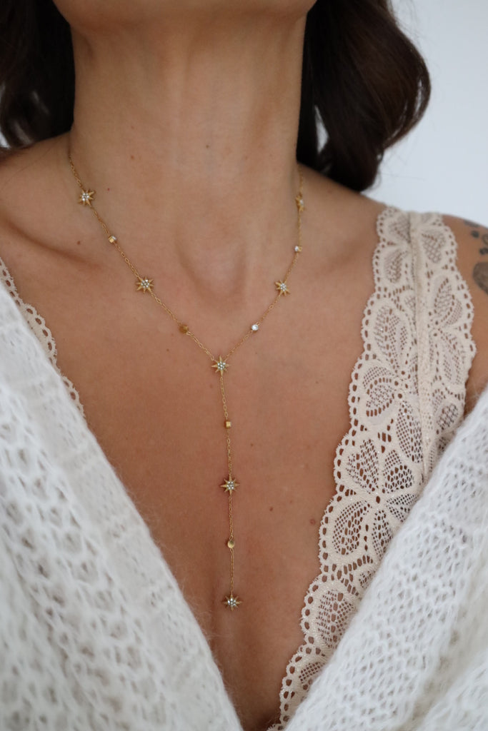Ce beau collier en acier inoxydable doré avec ses petites étoiles serties de pierres de zircons blancs est réglable de 40 à 45cm.