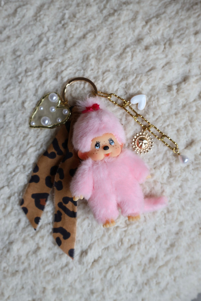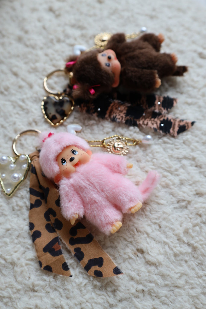 Porte-clés avec un Kiki rose, plusieurs charm's et un joli tissus léopard, à accrocher à ses clés ou à son sac pour une touche fun et stylée.