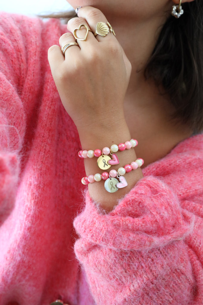 Composé de perles nacrées roses et blanches, il est orné d’un médaillon gravé du ruban symbole de l’espoir ainsi que d’un charm cœur émaillé, pour représenter la force, l’amour et la solidarité.